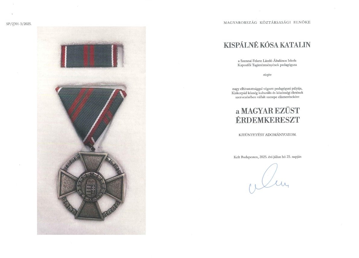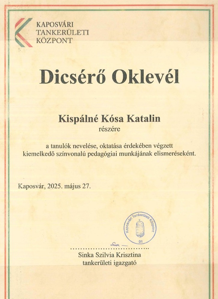 - Kispálné Kósa Katalin dicsérő oklevelet kapott a Kaposvári Tankerületi Központtól a tanulók nevelése, oktatása érdekében végzett kiemelkedő színvonalú pedagógiai munkájának elismeréseként.