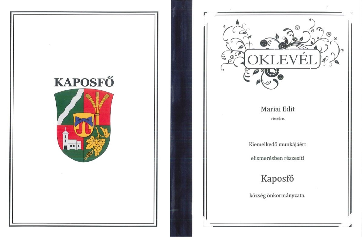 - Mariai Edit elismerő oklevelet kapott Kaposfő község önkormányzatától kiemelkedő munkájáért.