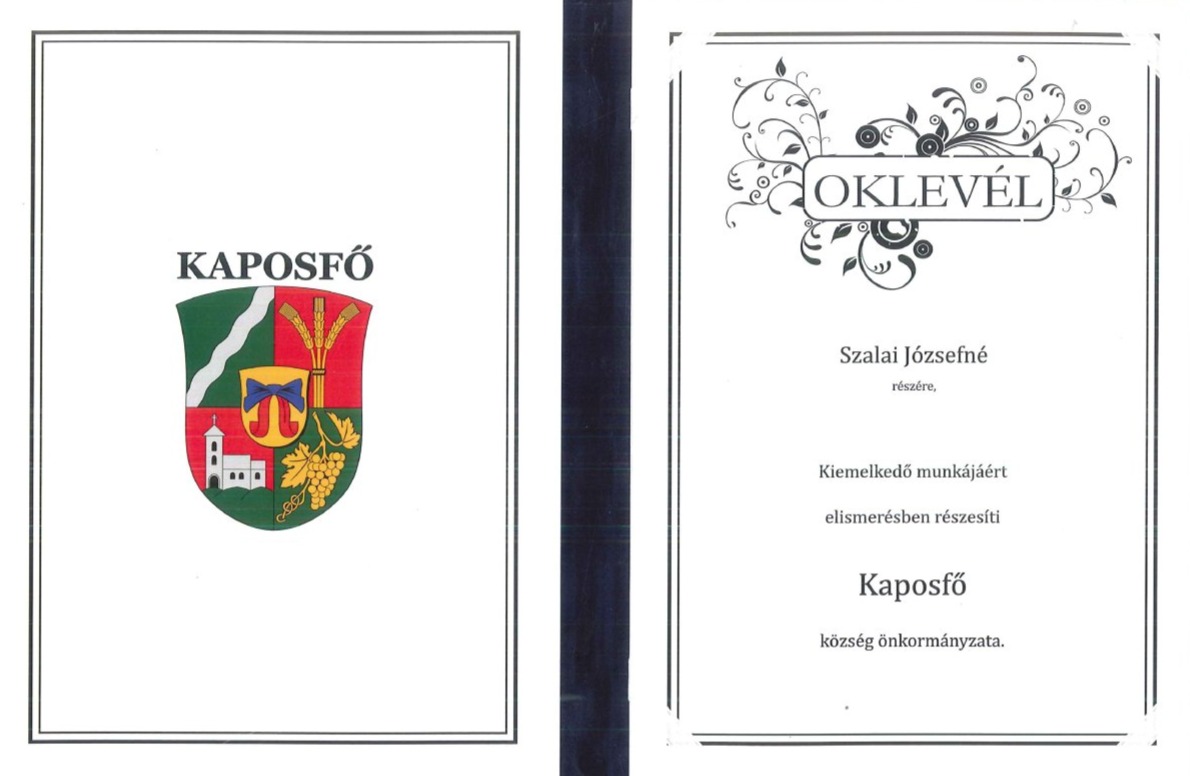 - Szalai Józsefné elismerő oklevelet kapott Kaposfő község önkormányzatától kiemelkedő munkájáért.