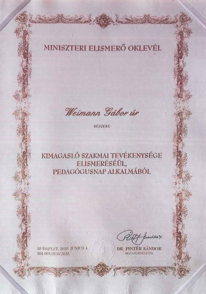 - Weimann Gábor miniszteri elismerő oklevelet kapott a belügyminisztertől kimagasló szakmai tevékenysége elismeréséül.