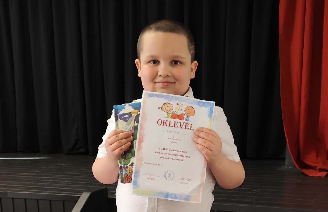 Február 25-én a nagybajomi iskola XXXIV. Csokonai-napok alkalmából vers- és prózamondó versenyt szervezett. Az 1-2. osztályosok kategóriájában Buzási Olivér 2.a osztályos tanuló különdíjban részesült. Gratulálunk!